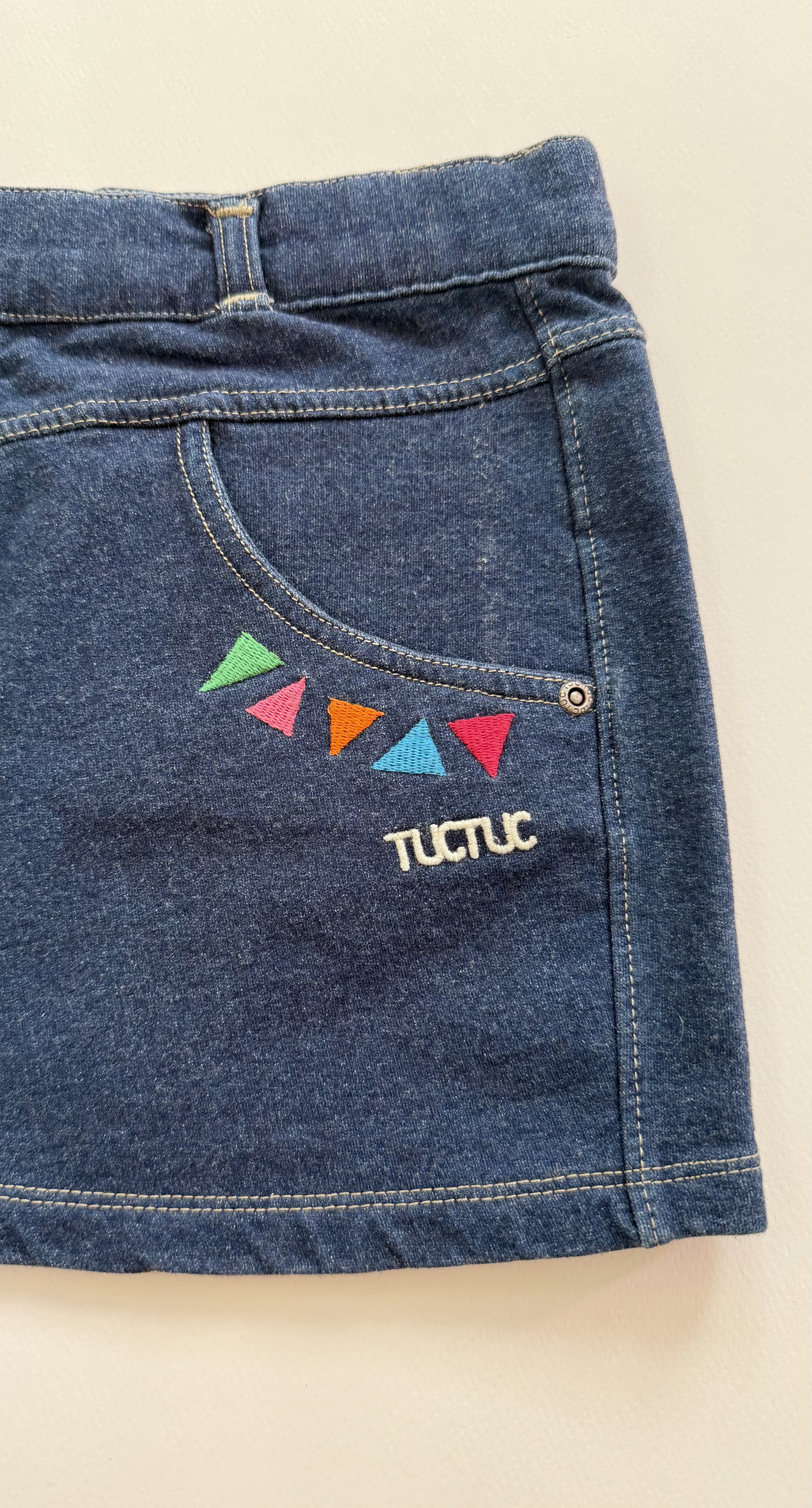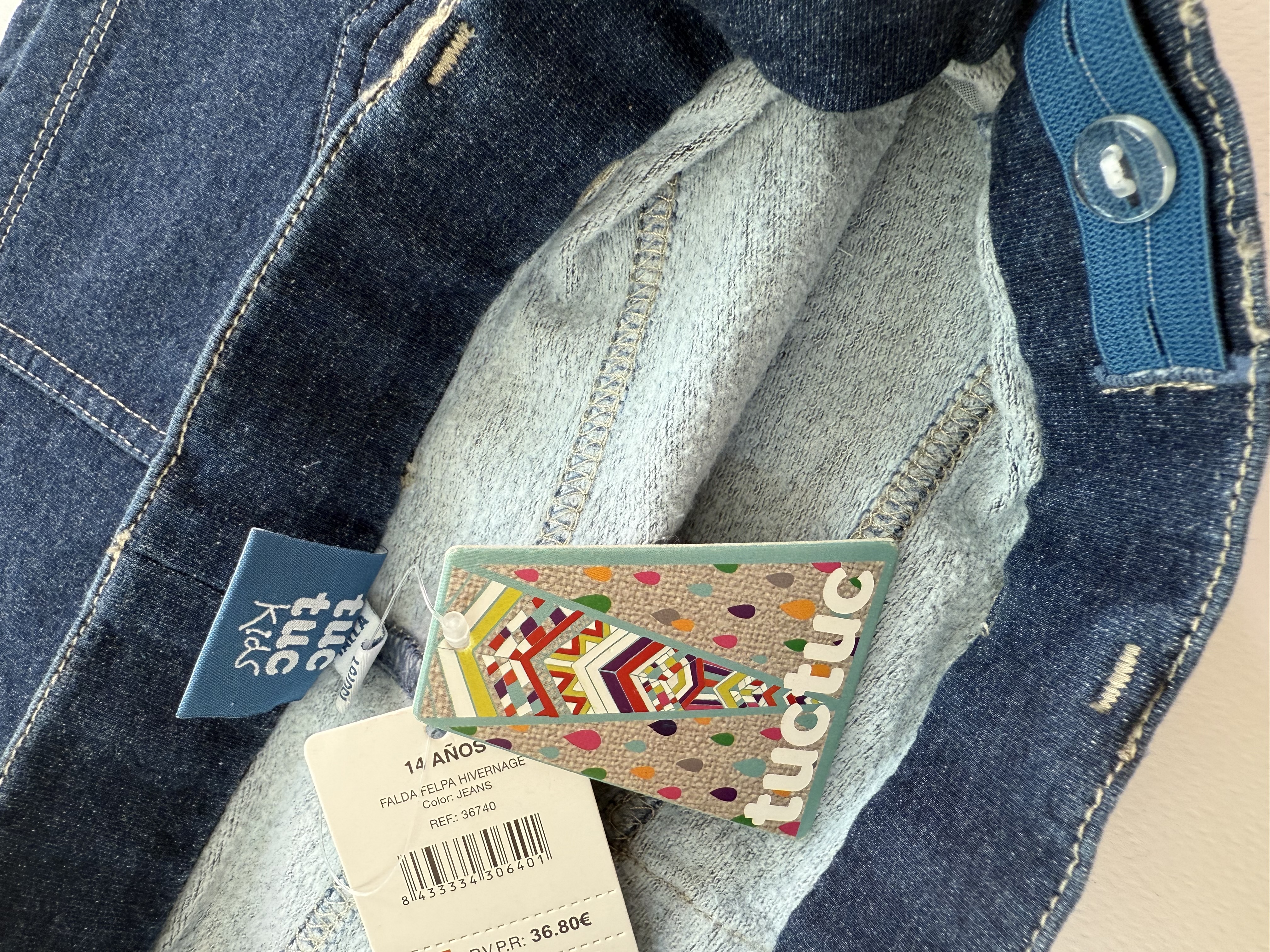 دامن جین دخترانه برند توك توك اسپانيا اورجينال و باركددار، ۹۶٪ نخ پنبه، لطيف، مناسب چهار فصل، دو جیب جلو و دو جیب پشت، کمر دارای کش قابل تنظیم