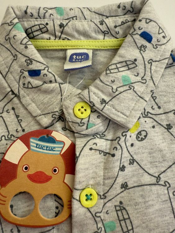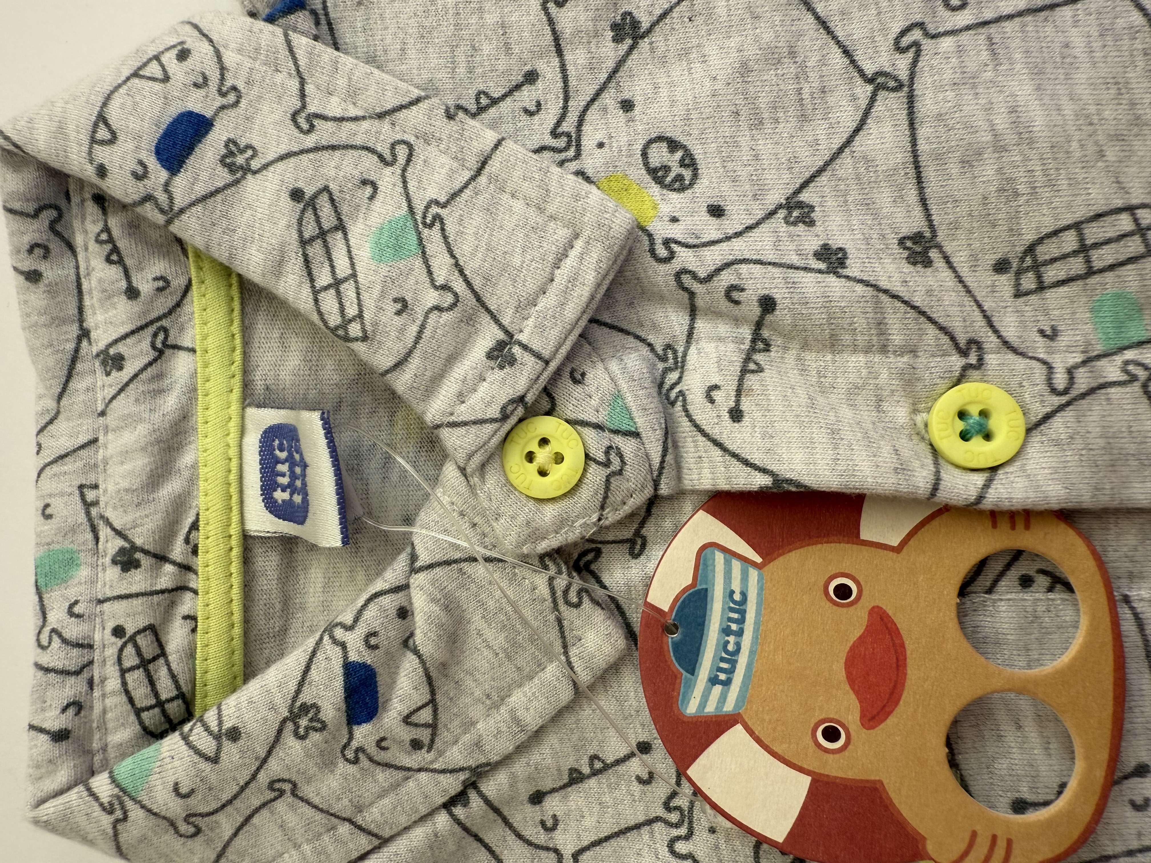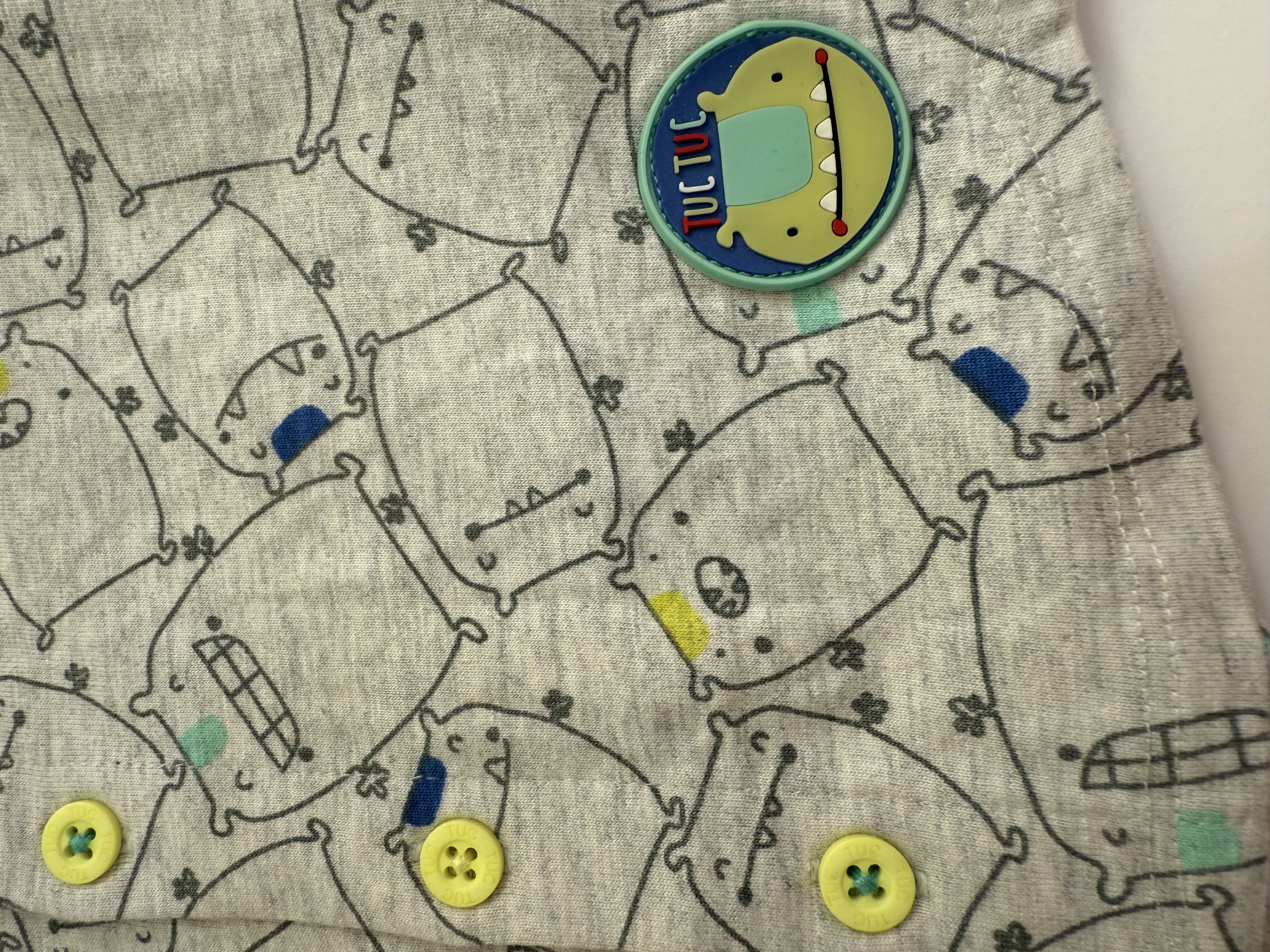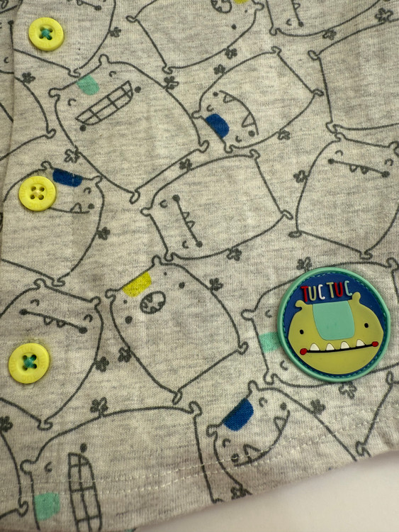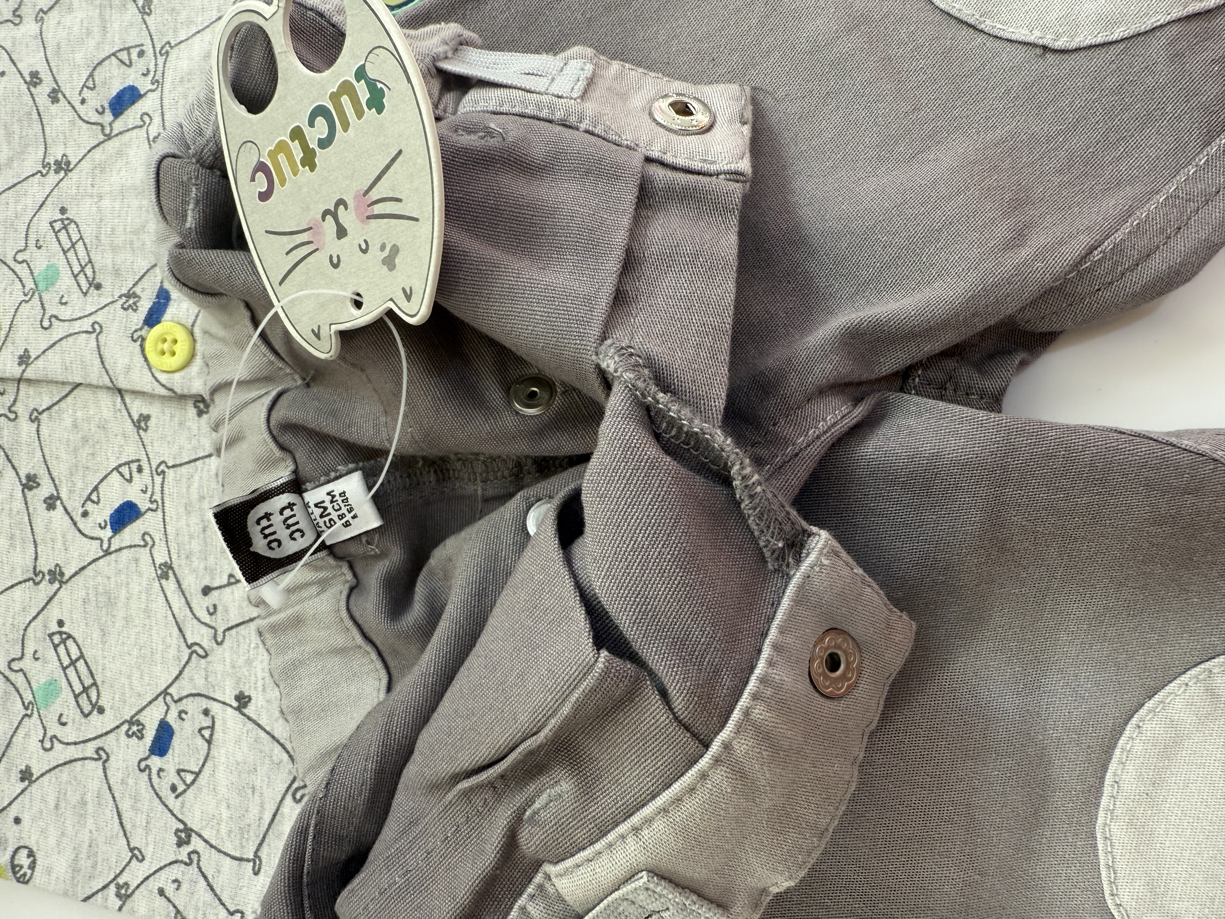 ست تیشرت آستین کوتاه و شلوار پسرانه، اورجینال بارکددار، برند توک توک اسپانیا، جنس تیشرت ۱۰۰٪ نخ پنبه، نام برند روی دکمه ها حک شده، طرح و جنس تیشرت فوق العاده لطیف و طرحش خاص و کمیابه، جنس شلوار کتان ۹۸٪ نخ و ۲٪ کش، هم کشی هم سبک جهت راحتی کودک، مناسب بیرون و داخل، کمر شلوار قابل تنظیم و دارای دکمه ی زاپاس، در کل خیلی ست شیکیه.
