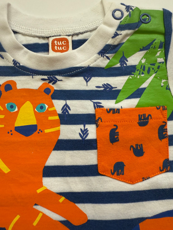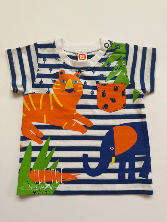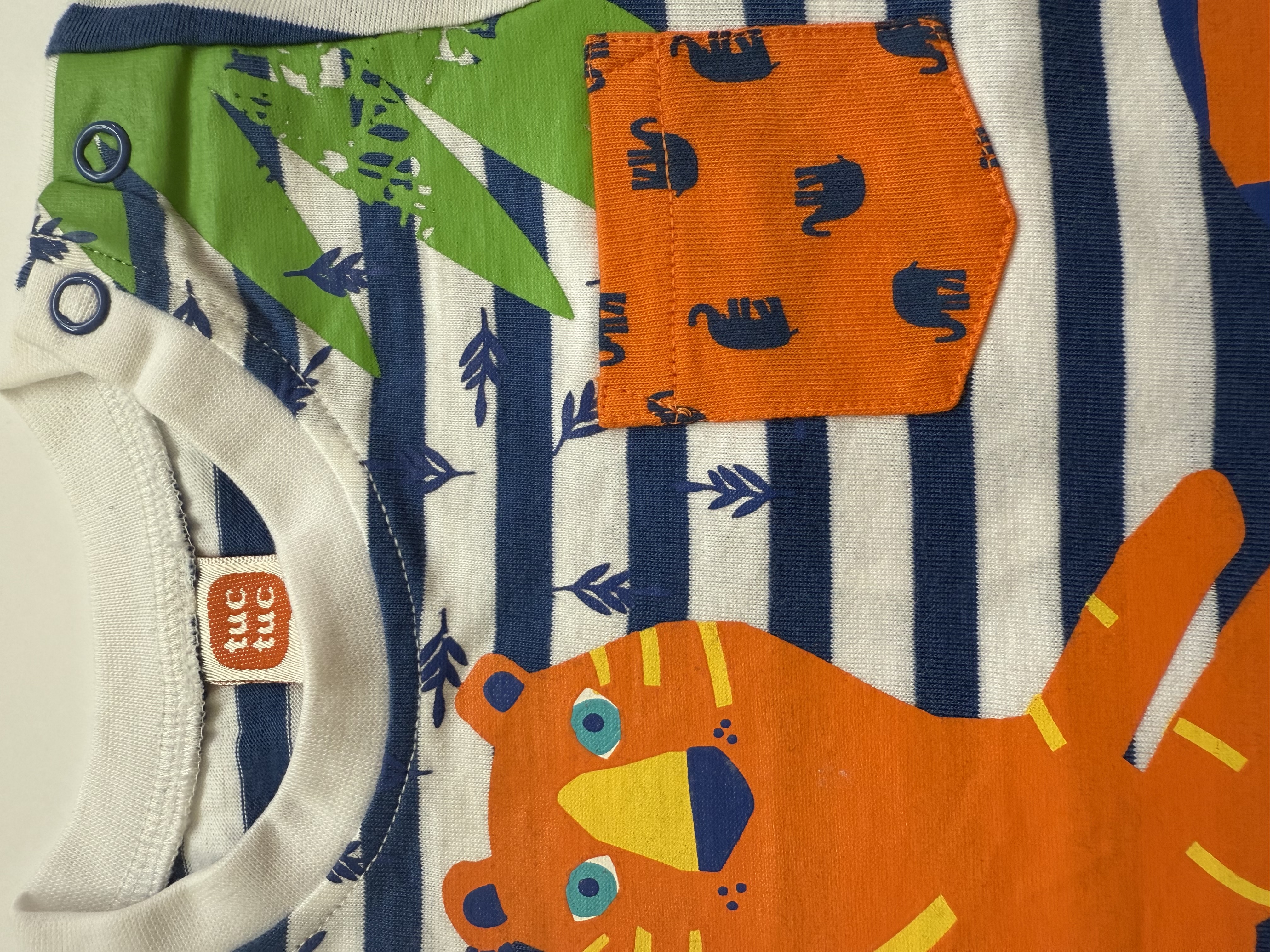 تیشرت پسرانه برند توک توک اسپانیا، اورجینال و بارکددار، جنس ۱۰۰٪ نخ پنبه ی لطیف، بسیار زیبا و خوشرنگ و لعاب، دو دکمه فلزی فشاری در یقه برای سهولت در پوشیدن، یک جیب نقلی و طرح جذاب روی تیشرت مناسب گل پسرا 🐯🌈